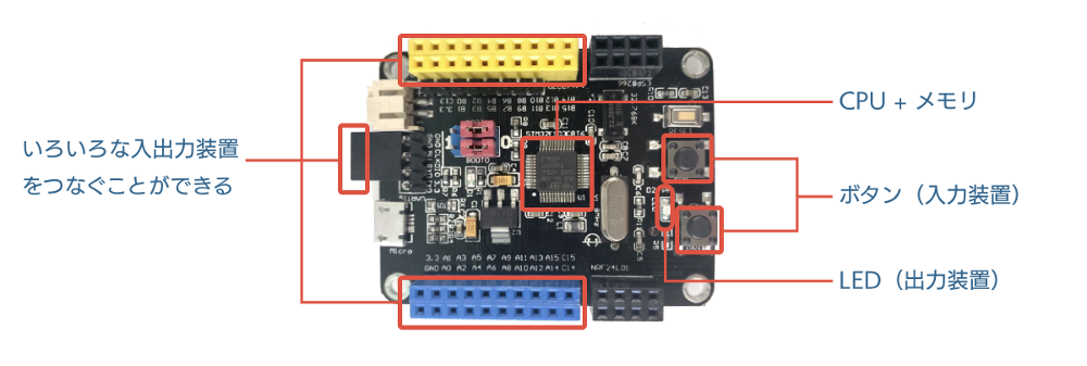 さて、いよいよ、ものづくりコンピューター「SPCEBLOCK」のお話をしましょう。SPACEBLOCKは、4.5cm×5.5cmの小さな姿ですが、ちゃんと「CPU」「メモリ」「入力装置」「出力装置」が入っている立派なコンピューターです。