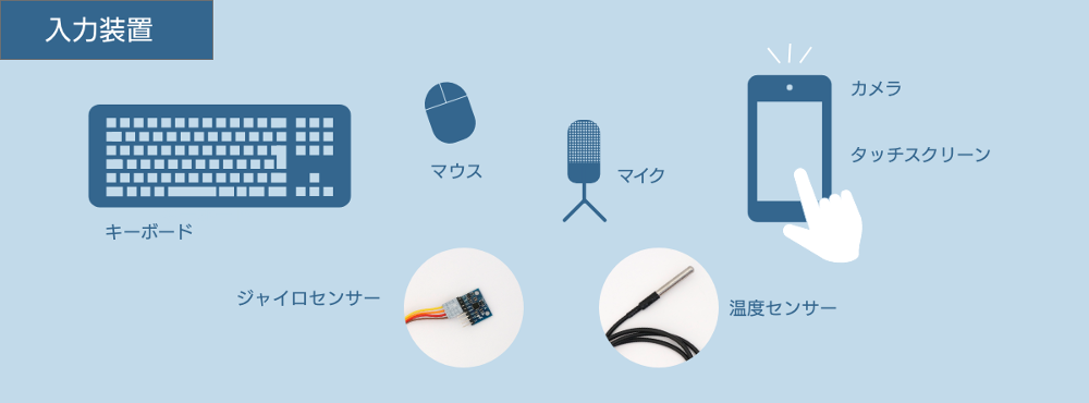 入力装置は人が操作するものばかりではありません。たとえば、水温を測ってその温度をコンピューターに渡すことができる部品は、入力装置です。同じように、湿度、明るさ、ものの傾きなどを計測する部品もあり、これらも入力装置になります。