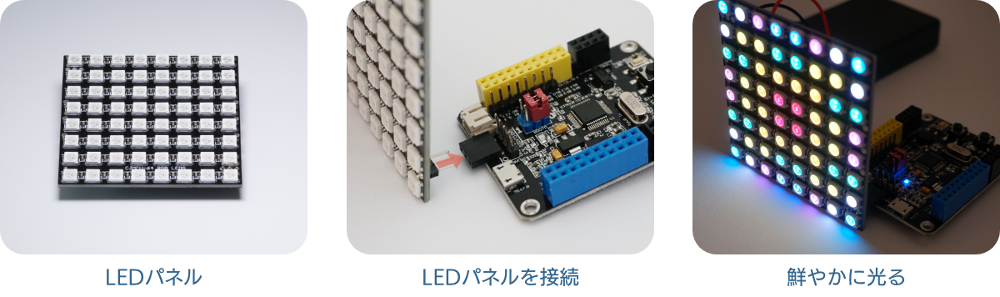 たとえば、比較的簡単に使える出力装置がこちらのフルカラーのLEDパネル。縦に8個、横にも8個、合計64個のLEDが並んでいて、カラフルな文字や絵を表現することができます。SPACEBLOCKが生まれた徳島は、実はLEDの開発や生産で日本のトップを走る先端地域として有名です。