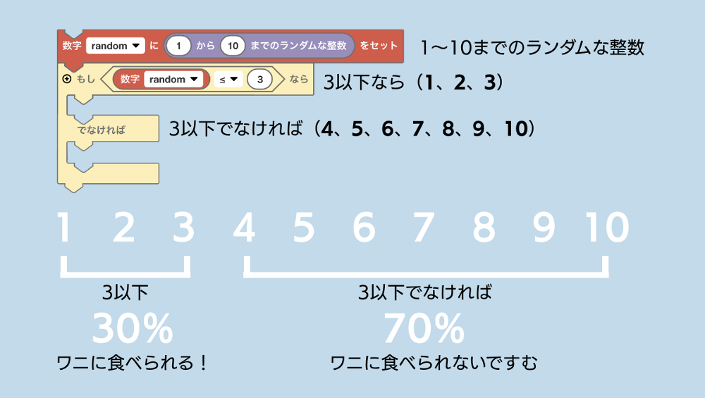 このプログラムでは、1〜10の整数の乱数を発生させて、3以下の場合はワニに食べられるようにしました。乱数が1〜3の場合ならワニに食べられて、4〜10の場合は食べられずにすみます。食べられる確率が30%で、食べられない確率が70%です。