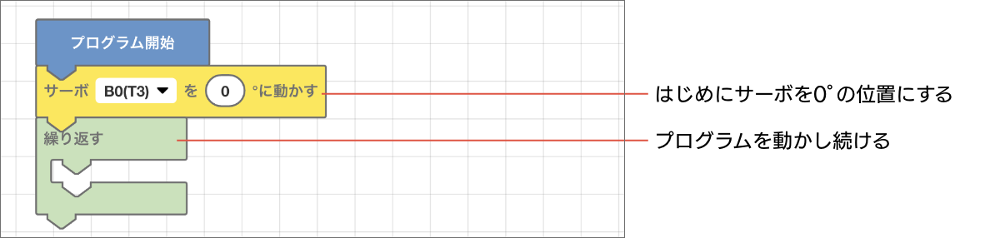 まず、次の図の通り、プログラム開始と同時にサーボの位置を0°にするプログラムを作成します。