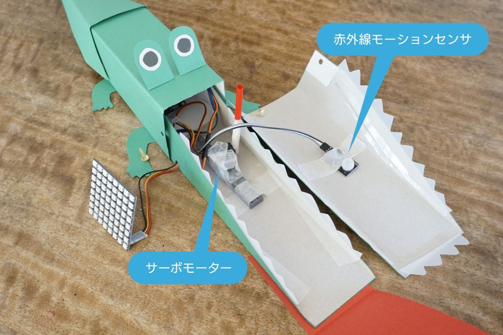 今回作りたいのは、ワニの口に手を入れると口がパクッと閉じる仕組みです。入力装置として、動きを検知できる赤外線モーションセンサを使用し、出力装置として0°から180°の回転の動きができるサーボモーターを使用します。ワニの口に手が入ったことを赤外線モーションセンサで検知して、サーボモーターの動きでワニの口を開閉します。