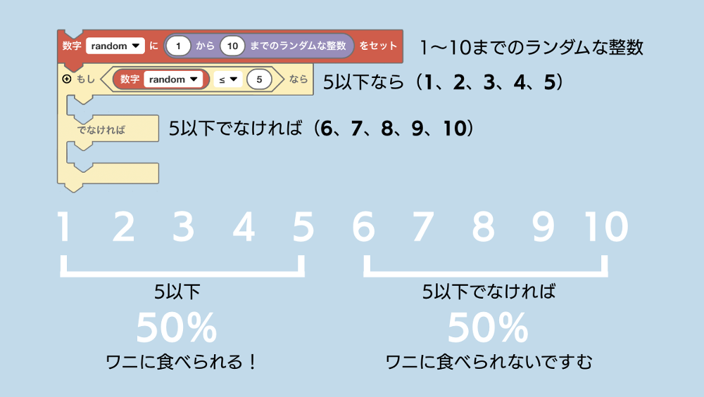 ワニに食べられる確率を50%にする場合、1〜2の整数の乱数を発生させて、1の場合はワニに食べられるというプログラムにすることもできます。