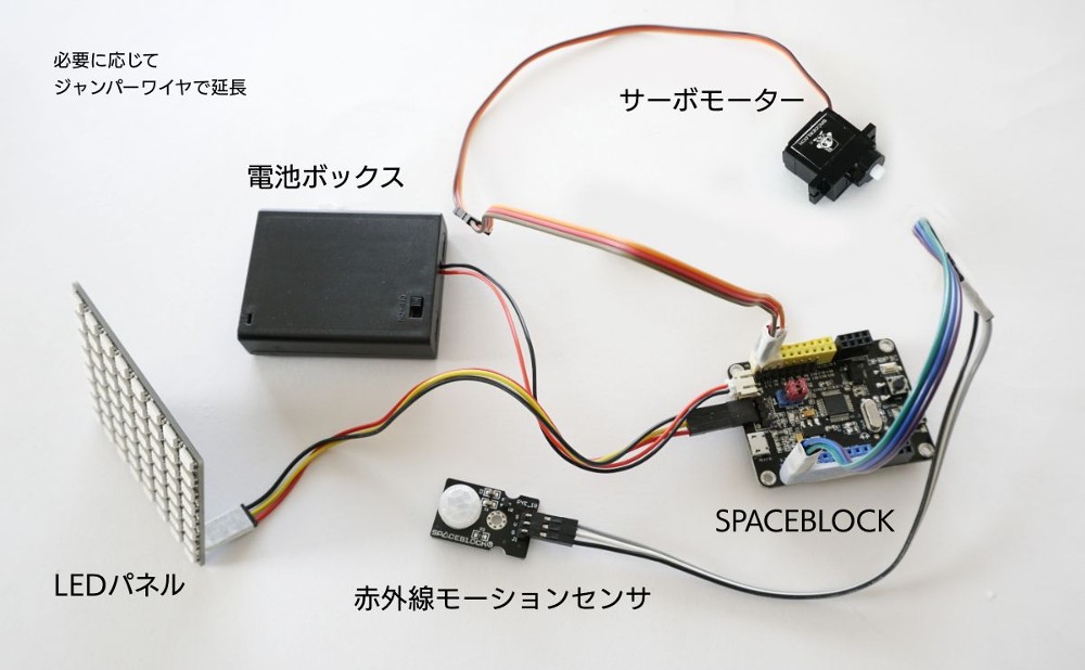 まずは、今回使用するLEDパネルと赤外線モーションセンサ、サーボモーターをSPACEBLOCKに接続してみましょう。