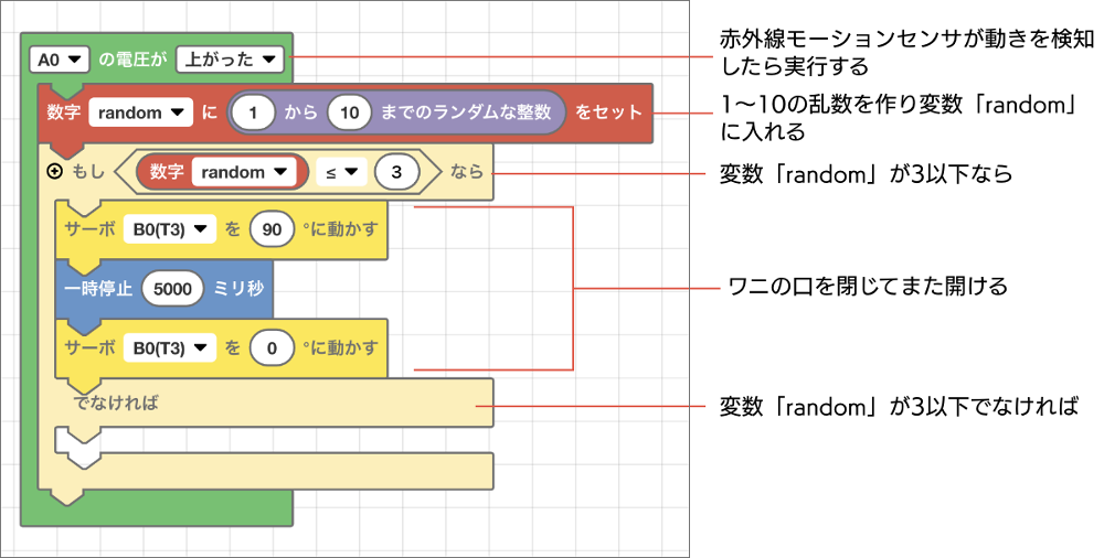 次の図の通り、[《A0》の電圧が《上がった》]ブロックで赤外線モーションセンサの値をチェックし続けます。手をワニの口に入れるとセンサが動きを検知して電圧が上がり、プログラムの実行が始まります。まず、乱数が発生し1〜10のいずれかの整数が変数「random」に入ります。そして、値が3以下ならワニの口が閉じて、そうでなければ口は開いたままになります。