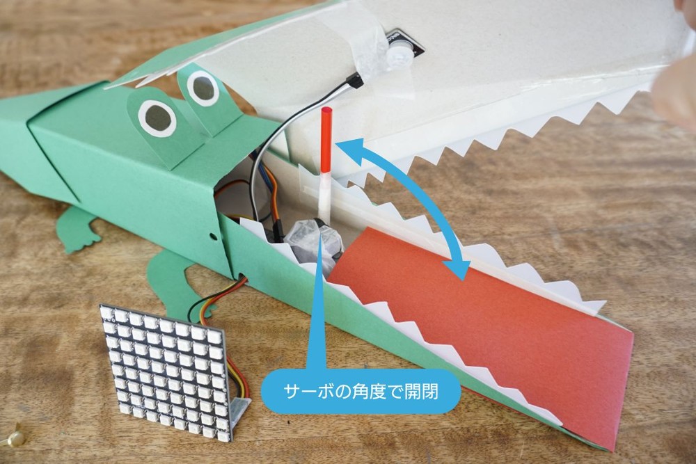 ワニの体部分には牛乳パックを使用し、厚紙でワニの口部分を作成。上あごは体に割ピンでとめ、重みで自然に閉まる構造にします。サーボモーターはストローをつけて上あごを押し上げられる程度の長さにします。