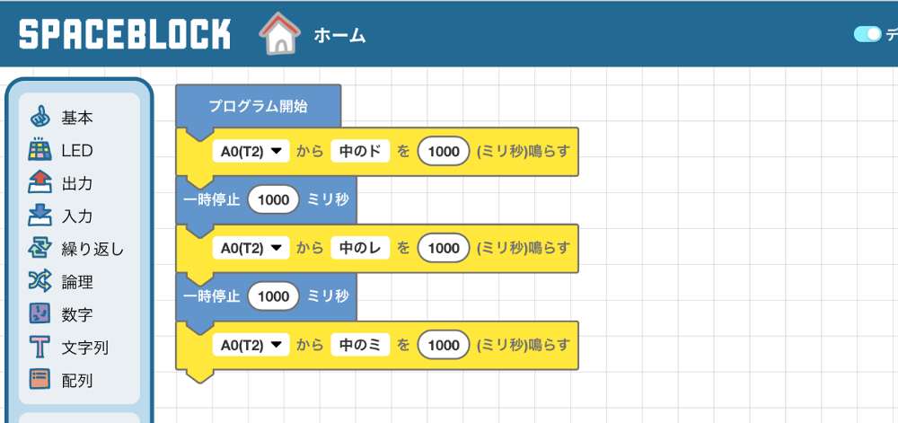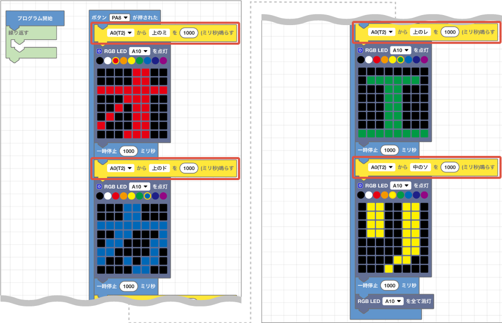 一文字ごとに音が鳴るように、プログラムを追加します。次の図の通り「ミ」「ド」「レ」「ソ」の音を1000ミリ秒ずつ鳴らすブロックを入れます。