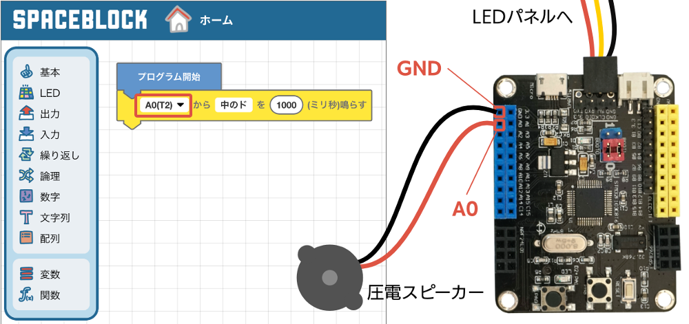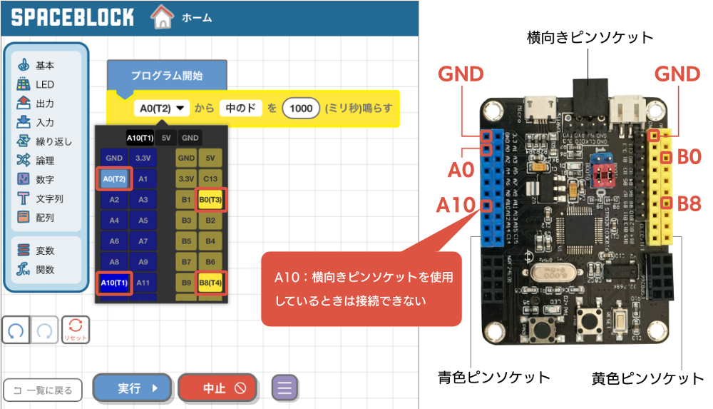 今回使用するのは、青色ピンソケットの「GND」と「A0(T2)」です。[《A0(T2)》から《中のド》を《1000》(ミリ秒)鳴らす]ブロックで「A0(T2)」を選択しましょう