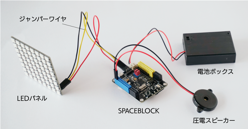 細かい部分は次の図を参考にしてください。LEDパネルは、横向きピンソケットに直接つなぐことができますが、今回は扱いやすいようにジャンパーワイヤでつなぎます。3本のワイヤをつなぐ場所が図の通りになるよう注意してください。圧電スピーカーは、赤と黒のワイヤの色を確認して青色ピンソケットの図の通りの場所につなぎます。