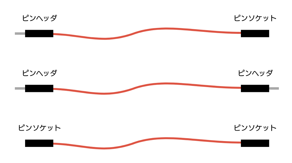 ジャンパーワイヤの先端は、「ピンヘッダ」か「ピンソケット」のどちらかです。両端の組み合わせで3種類ありますので、使いたい箇所に応じて選びましょう。SPACEBLOCKの「20cmジャンパーワイヤセット」は、3種類のジャンパーワイヤ各40本ずつがセットになっています。