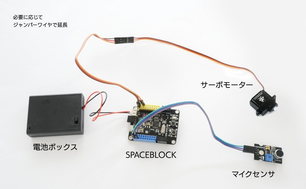 まずは、今回使用するマイクセンサ、サーボモーターをSPACEBLOCKに接続してみましょう。