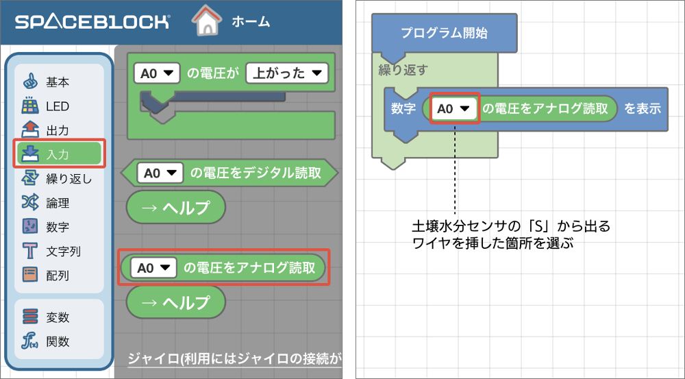 土壌水分センサは、測定した水分の量に応じてSPACEBLOCKに挿したピンヘッダの電圧を上げたり下げたりします。電圧の程度に応じて0から1023までの数値に置き換えてプログラムに値を渡しています。