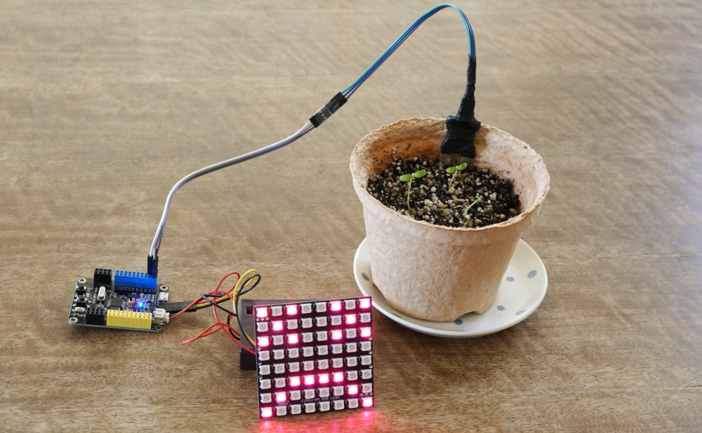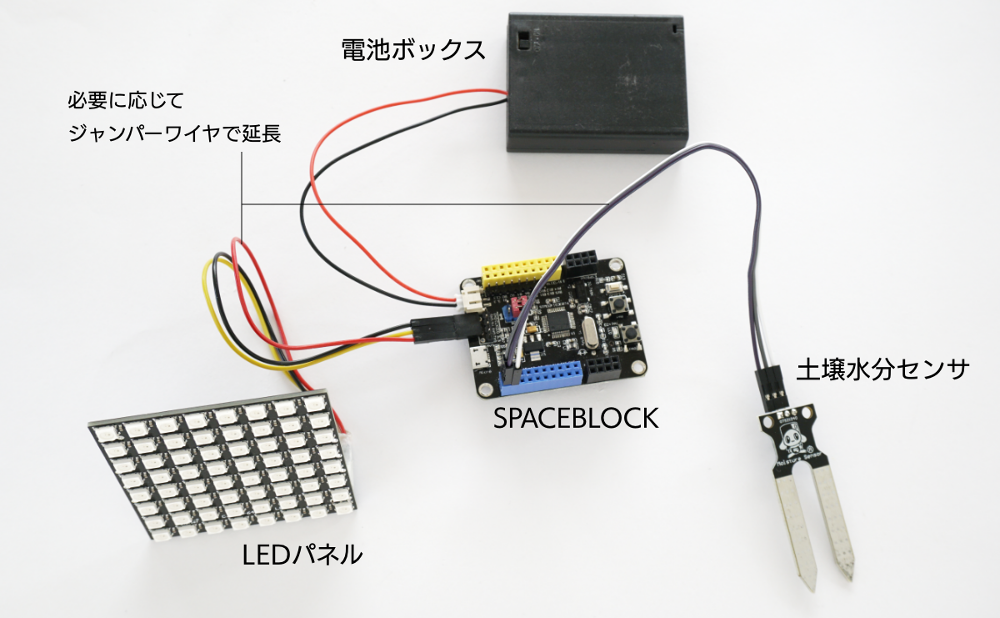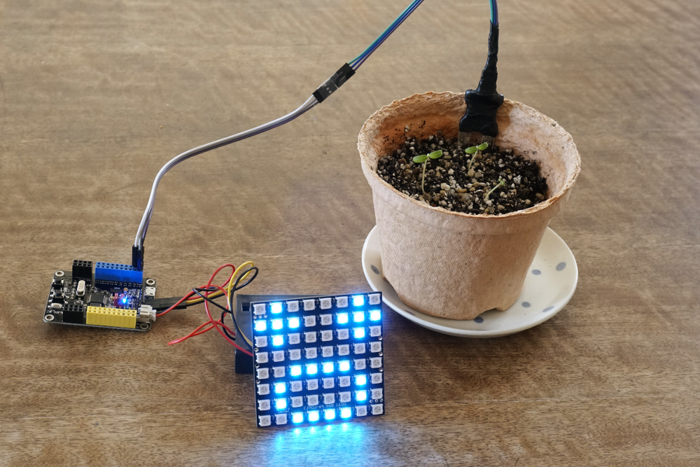 土壌水分センサの使い方がわかったところで、早速LEDパネルで警告を出す仕組みを作りましょう。