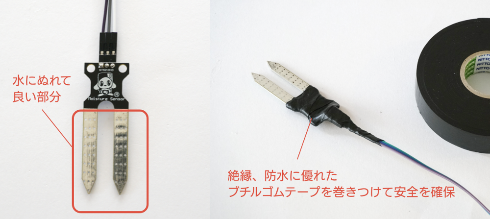 土壌水分センサの銀色の部分以外には、水がつかないように注意してください。SPACEBLOCK本体や配線部分も水がかからないように扱ってください。故障や発火などの原因となります。水がかかるおそれのある部分には絶縁テープを巻いて安全に使いましょう。ビニールテープも利用できますが、防水性にも優れたブチルゴムという素材のテープは接着剤ではなく素材同士がくっつき合うので扱いやすく便利です。