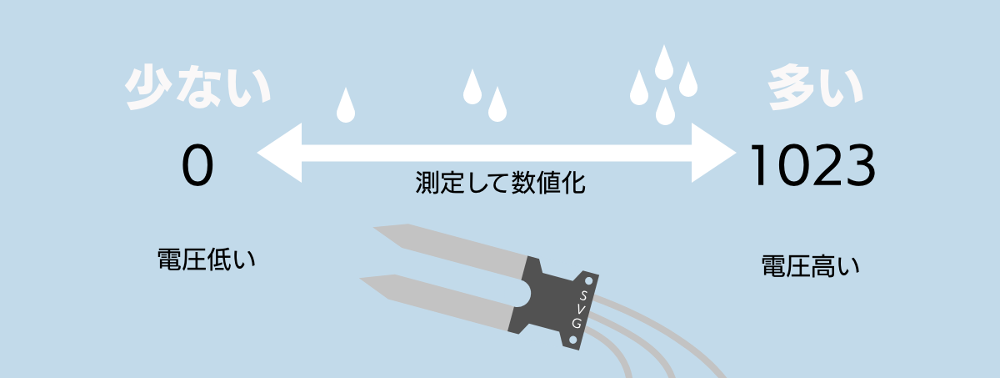 土壌水分センサは、土の中の水分量を測定することができます。水分がない状態が0で、水分が多くなるほど数値は大きくなります。このように量や大きさなどの程度を数値でプログラムに渡すことをアナログ入力と呼びます。