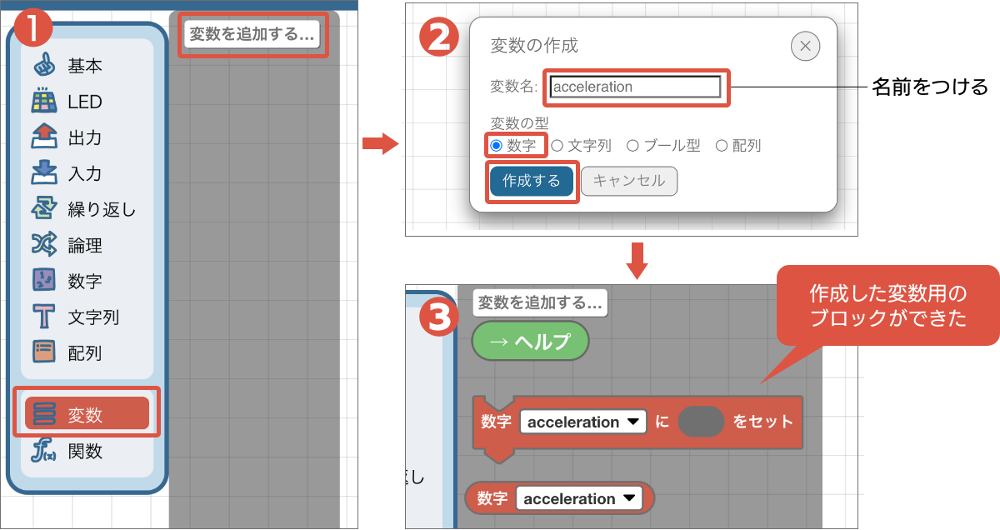 新しい変数を作成し「acceleration」と名前をつけます。