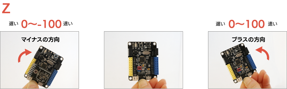 動くスピードが遅いと0に近く、速いと100に近い数字になり、軸ごとにプラスの方向とマイナスの方向の傾きがあります。