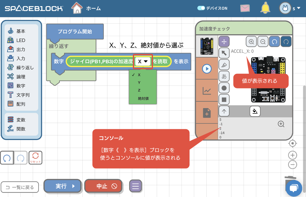 プログラムを実行し、三軸ジャイロセンサをつけたSPACEBLOCKを動かしてみると、傾きの方向やスピードに応じて値が変化するのがわかります。「X」、「Y」、「Z」、「絶対値」の値と動きの関係をそれぞれ確認してみましょう。なお、「絶対値」には、X、Y、Zの加速度の絶対値のうち最も高い値が採用されます。