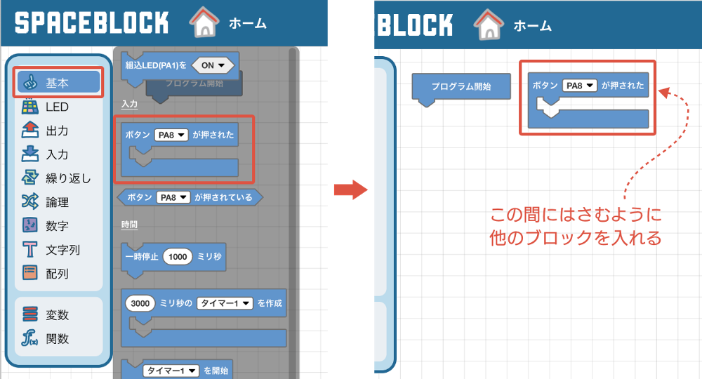 [ボタン(PA8)が押された]ブロックは、間に他のブロックをはさめる