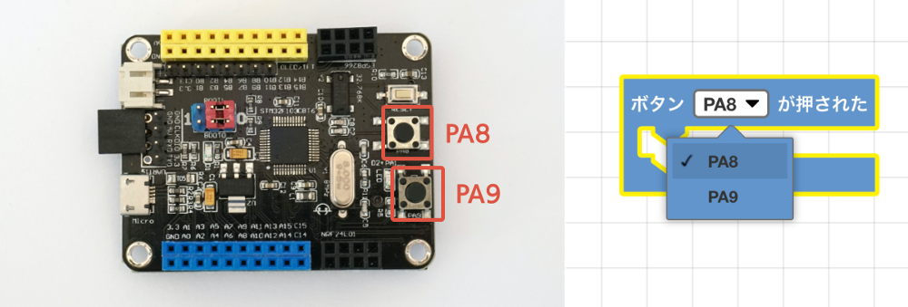 SPACEBLOCKにはボタンが2個ついていて、それぞれに「PA8」と「PA9」という名前がついています。[ボタン(PA8/PA9)が押された]ブロックを使うときは、どちらのボタンへの指示なのか正しく指定しましょう。