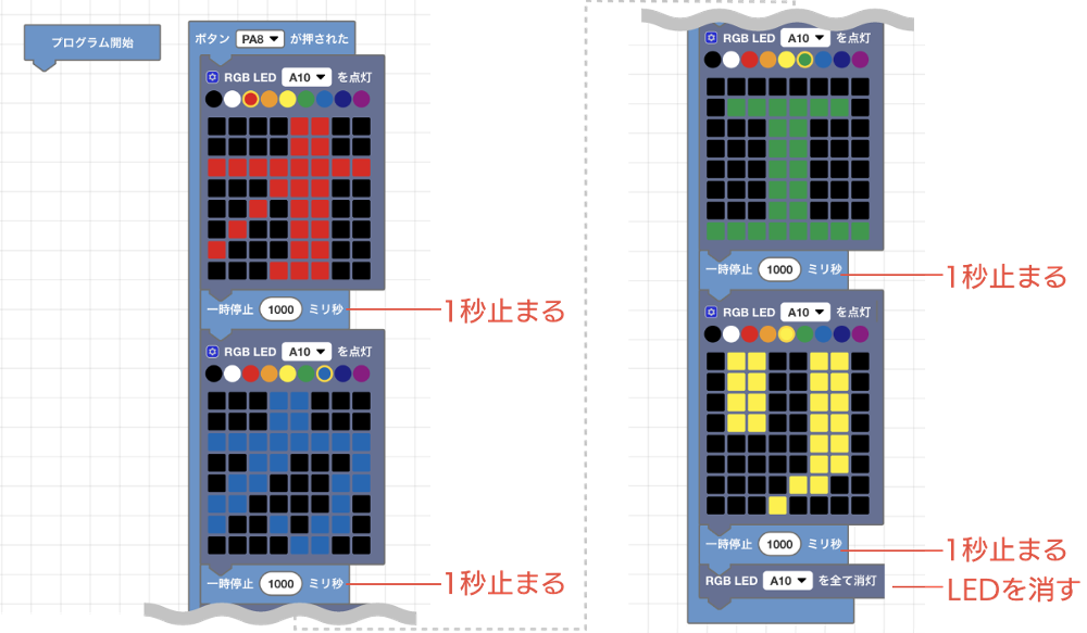 つづいてLEDパネルのプログラムです。次の図の通り、ボタンが押されたときに、「オ」「カ」「エ」「リ」という文字が順に表示されるようにプログラムします。[RBG LED(A10)を点灯]ブロックで文字を指定し、[一時停止(1000)ミリ秒]ブロックを間に入れて各文字が点灯する時間を作り、最後には[RBG LED(A10)を全て消灯]ブロックでLEDを消します。