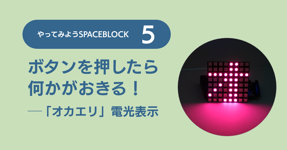 小さなものづくりコンピューター「SPACEBLOCK(スペースブロック)」を使って、LEDパネルの電光表示装置を作りましょう。[SPACEBLOCK-4]では、電源を入れたら8×8 RGB LEDマトリックスパネル(LEDパネル)が光るというプログラムでしたが、今回は、「ボタンを押したらLEDが光る」というプログラムにアレンジします。