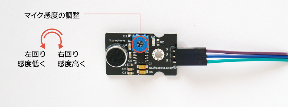 マイクの感度はマイクセンサのポテンショメータという調整用の軸をドライバなどで回して調節します。感度に応じて、どのくらいの音の大きさをどのくらいの数値で取得するかが変わります。今回は、音楽を流していないときに0が安定して表示される程度に調整しました。