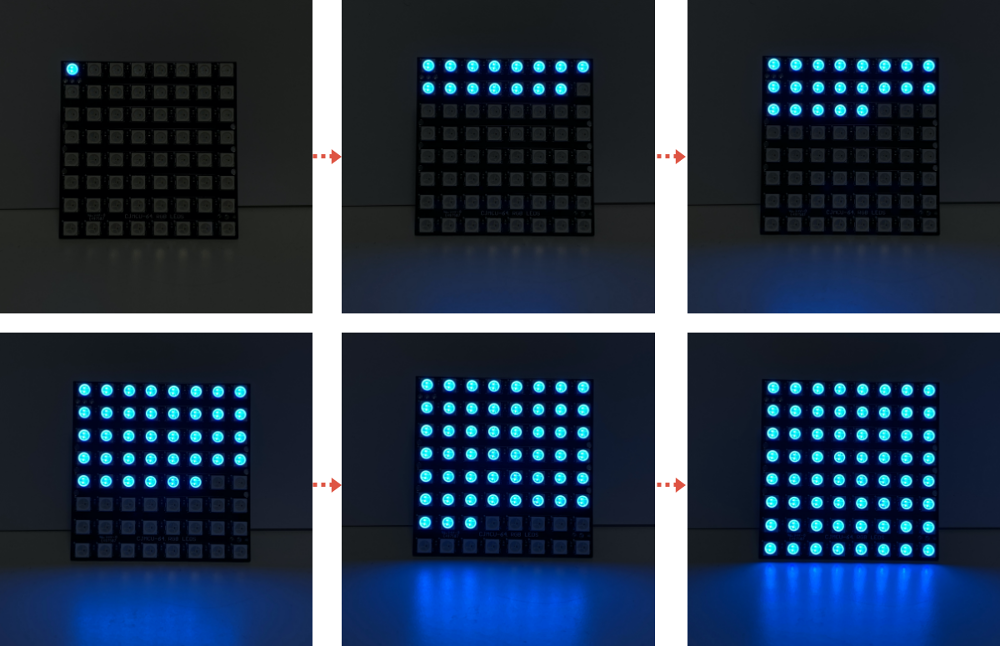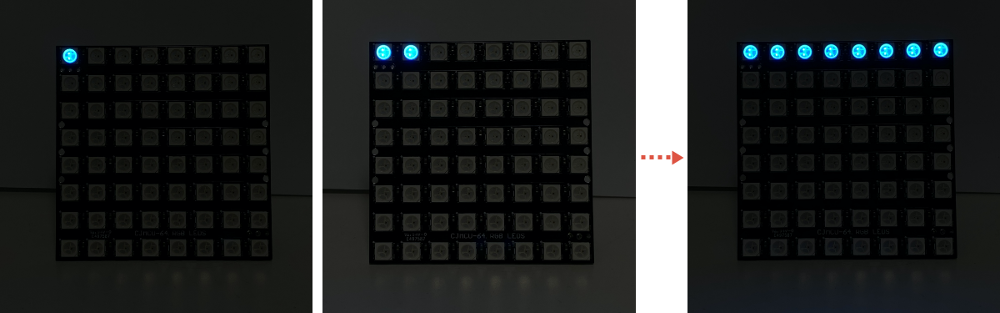 プログラムを実行すると、LEDパネルの左上から順に点灯し右端まで8個点灯すると、次の行の左端からまた順番に点灯します。8行目の右端で終わります。
