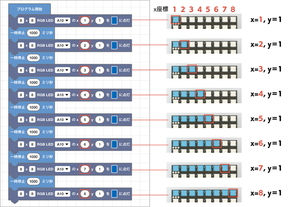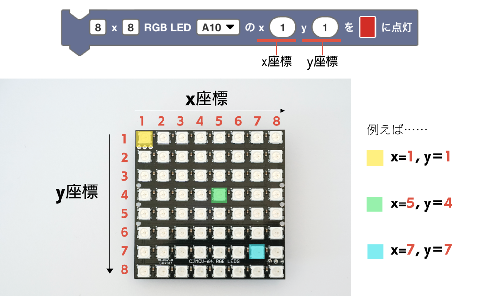 ライトの位置を指定して点灯するには、「LED」カテゴリーの[8×8 RGB LED《A10》のx《1》y《1》を《色》に点灯]というブロックを使います。位置は、x座標、y座標で指定します。