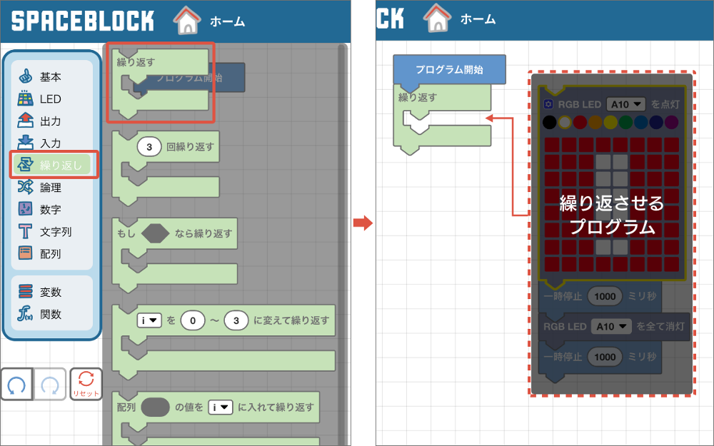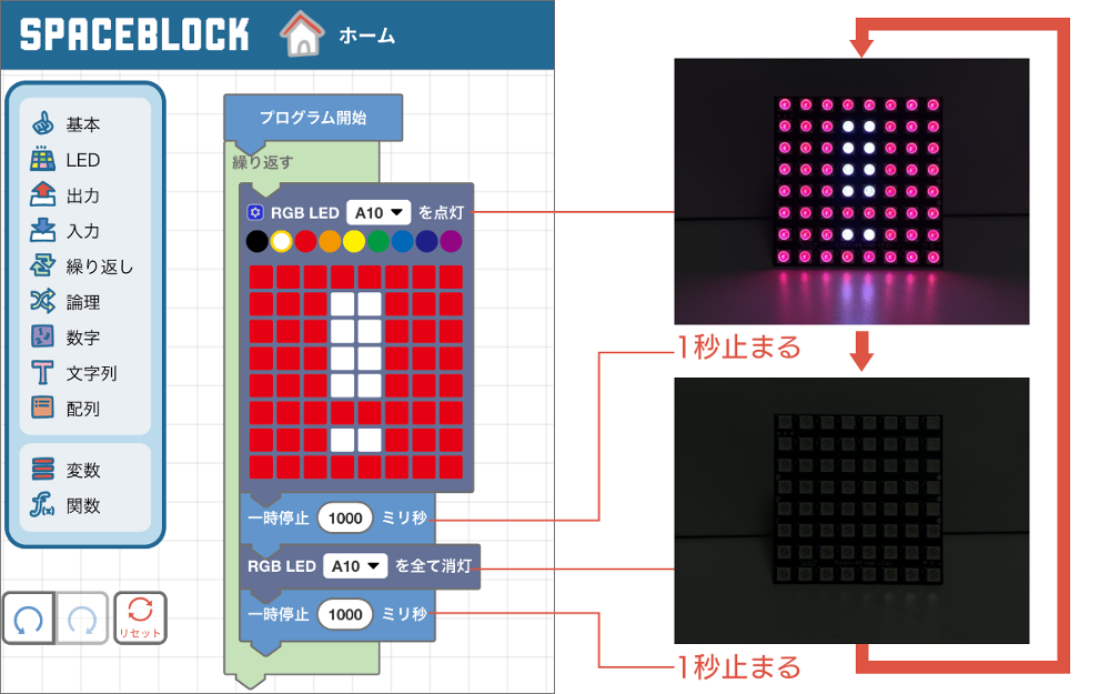 小さなものづくりコンピューター「SPACEBLOCK(スペースブロック)」でさまざまな機能を作るために、プログラミングの技を磨いていきましょう。今回は、LEDパネルを使って、 プログラミングの基本技である「繰り返し」を使いますよ!