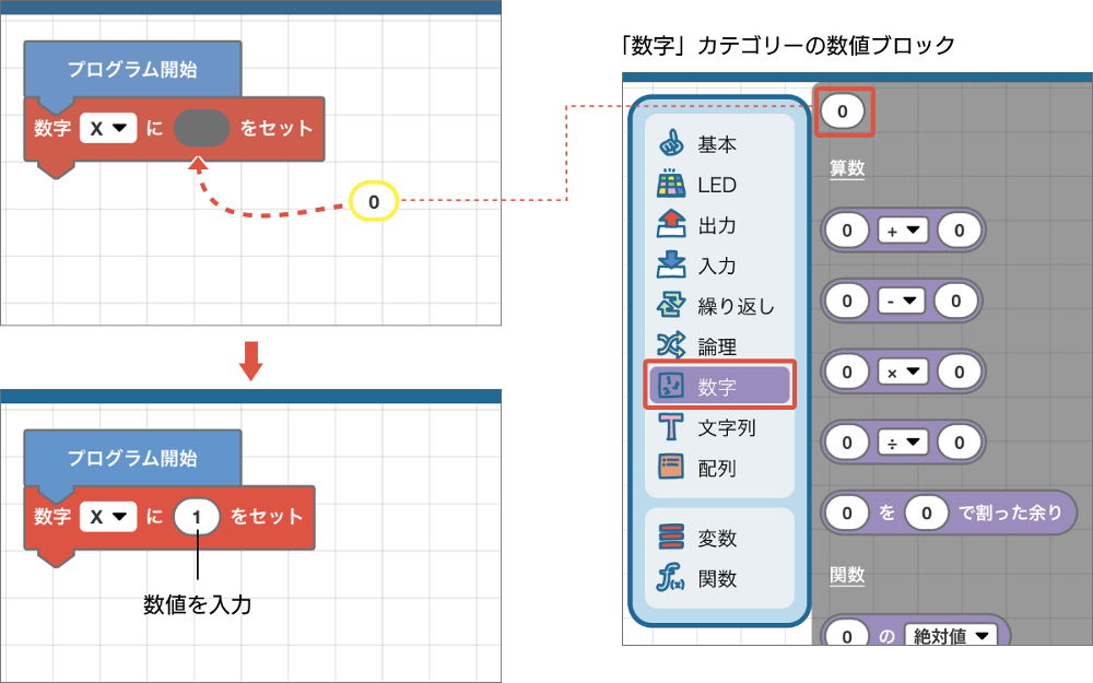 次に、今作った変数「X」に、最初の値として「1」を入れます。次の図の通り、[プログラム開始]ブロックに[数字《X》に《 》をセット]をつなぎ、1を指定してください。