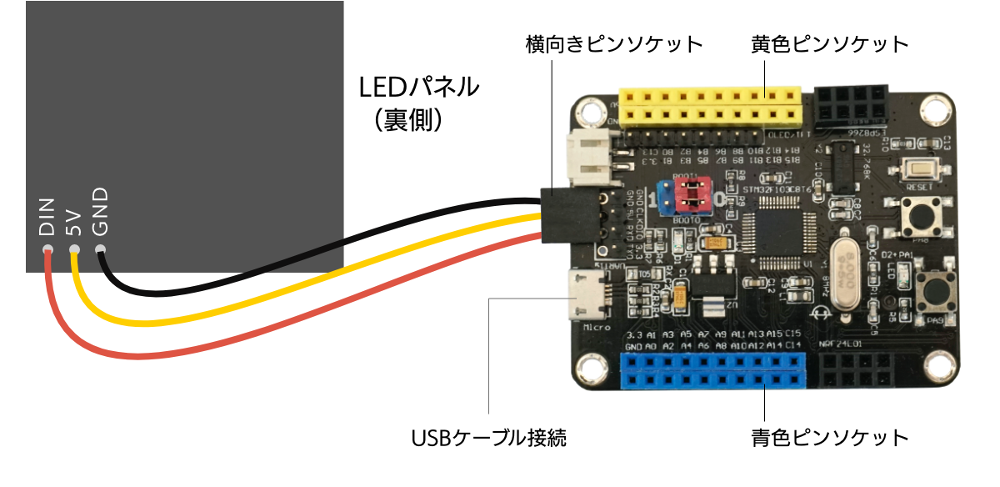 次に、LEDパネルのライトを1個ずつ順番に点灯させてみましょう。LEDパネルには8×8の合計64個のLEDが並んでいて、これら1個ずつを個別に指定して点灯したり消灯したりすることができます。