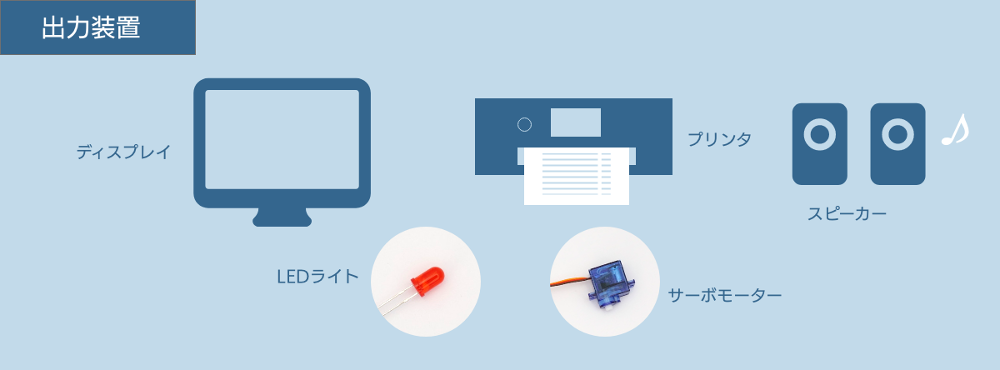 出力装置も人が使うものばかりではありません。コンピューターの計算結果によって回転の速さが変わるモーターや、家電の動作状態を伝えるLEDライトなども出力装置です。