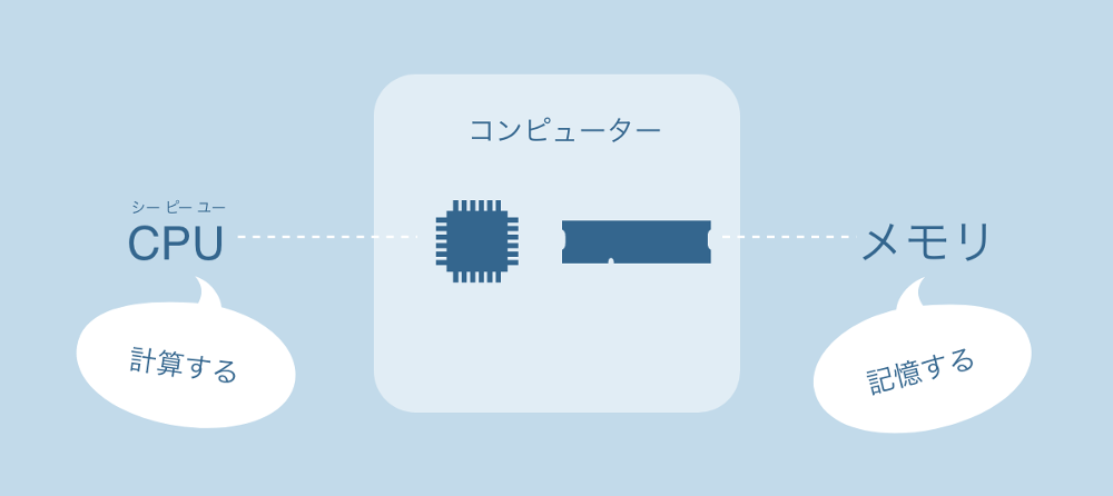 コンピューターは、指示された命令を正確にこなすことができる機械です。目に見える形はさまざまですが、どんなコンピューターも計算するための「CPU(シーピーユー)」と記憶するための「メモリ」を持っていて、命令通りの計算をすることができます。「CPU」は猛スピードで計算する頭脳で、「メモリ」は計算の結果や命令を記憶しておく場所です。