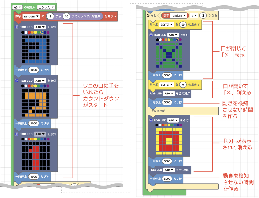 このプログラムに、LEDの演出を足します。次の図の通り、ワニの口に手を入れたことを検知したらカウントダウン表示をし、ワニに食べられるときは「×」、食べられずにすんだ場合は「○」の表示をします。また、判定が終わってワニの口が開いたり手を抜いたりする動きを赤外線モーションセンサーが検知しないように5秒の待機時間を入れます。