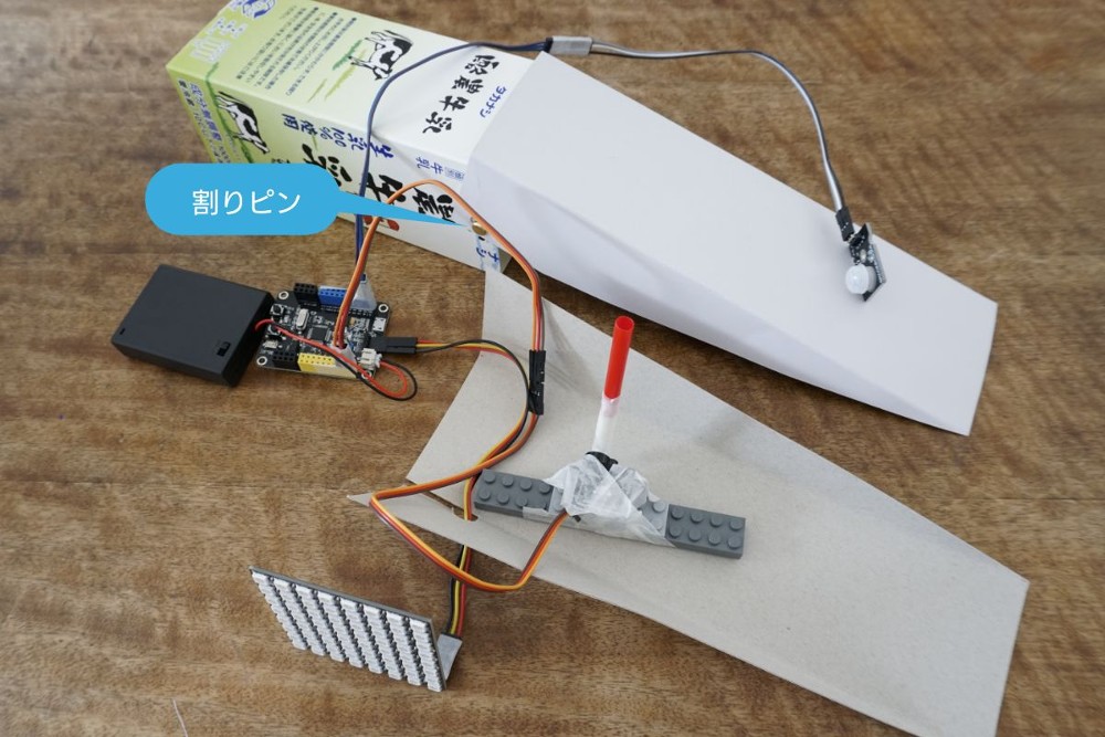 ワニの体部分には牛乳パックを使用し、厚紙でワニの口部分を作成。上あごは体に割ピンでとめ、重みで自然に閉まる構造にします。サーボモーターはストローをつけて上あごを押し上げられる程度の長さにします。