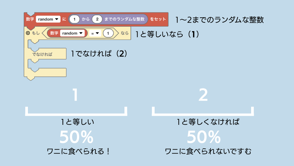 このプログラムでは、1〜10の整数の乱数を発生させて、3以下の場合はワニに食べられるようにしました。乱数が1〜3の場合ならワニに食べられて、4〜10の場合は食べられずにすみます。食べられる確率が30%で、食べられない確率が70%です。