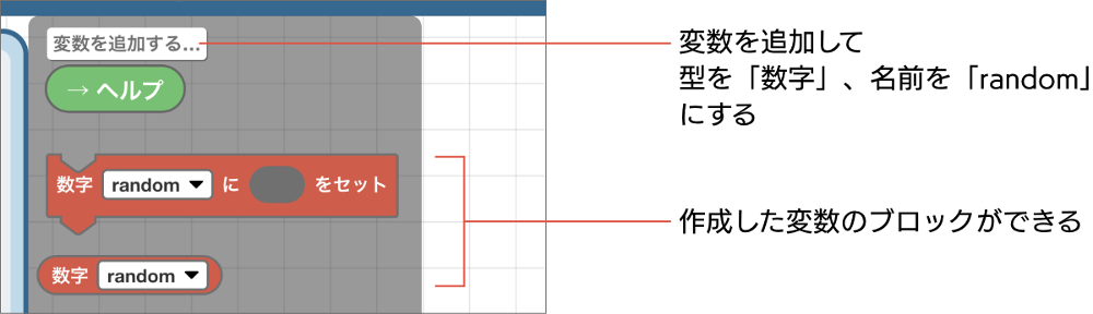 乱数を入れておくために、変数「random」を作ります。