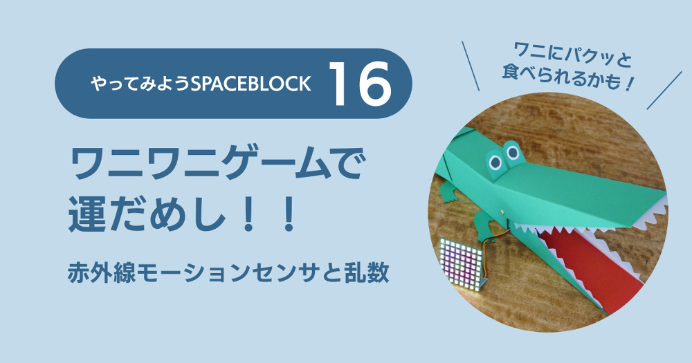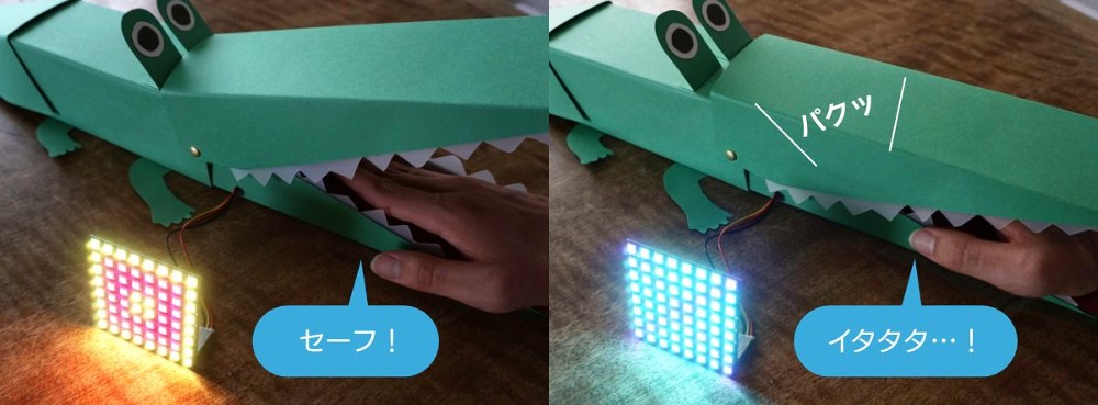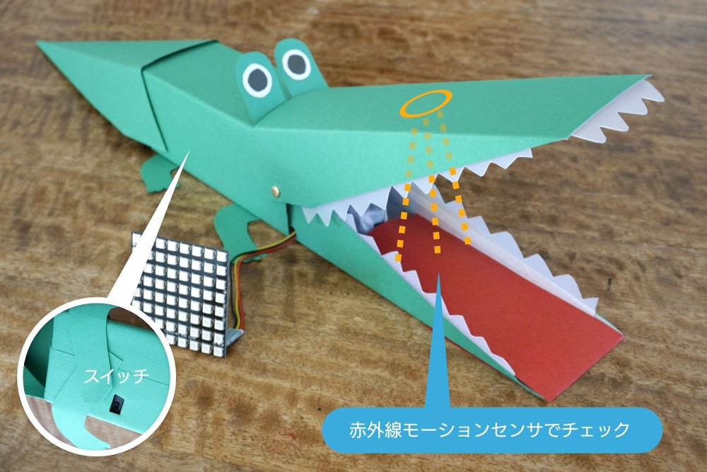 さぁ夏休み! 遊びをもりあげる楽しいゲームを作ってみましょう! ワニの口に手を入れると……パクッとかまれるかもしれないちょっとドキドキのゲームです。夏休みのプログラミング工作にもどうぞ!
