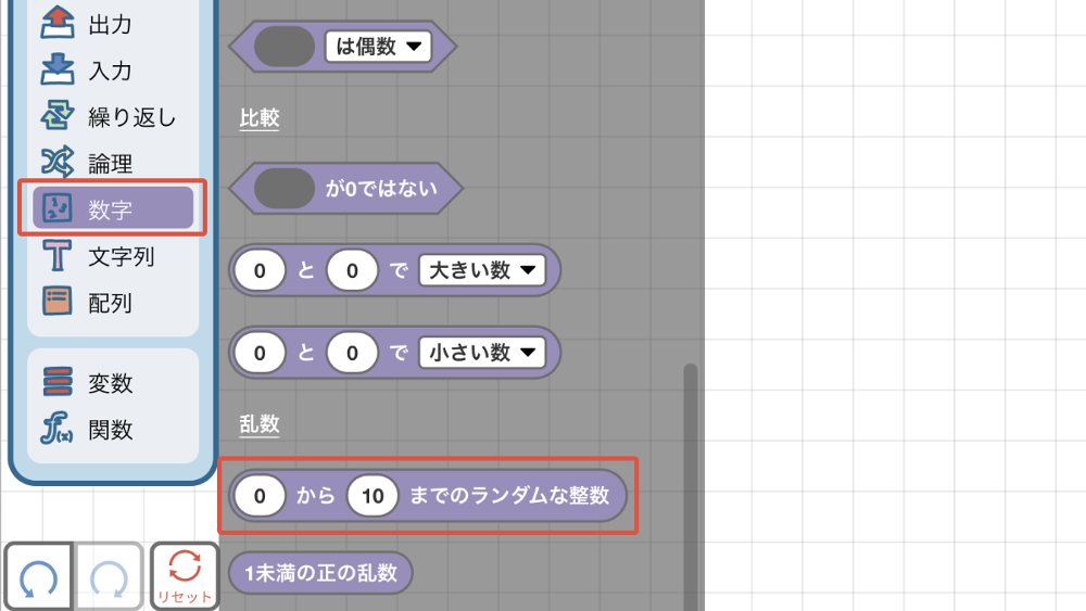 [《0》から《10》までのランダムな整数]ブロックを使うと、指定した数値の範囲からランダムな整数が発生します。サイコロを振ると1から6のどれかの数字が出るのと同じように、ランダムな数値は指定した範囲の数値が同じ確率で出るようになっています。