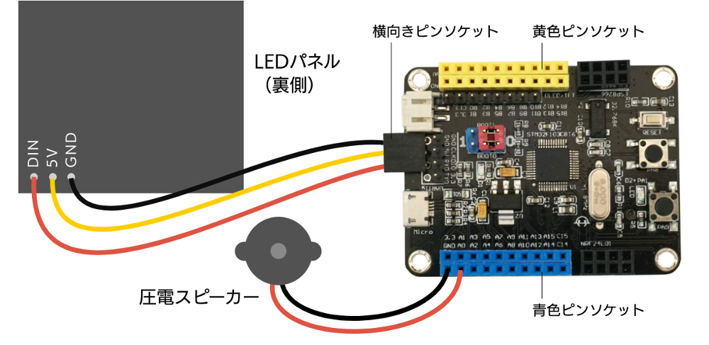 細かい部分は次の図を参考にしてください。LEDパネルは、横向きピンソケットに直接つなぐことができますが、今回は扱いやすいようにジャンパーワイヤでつなぎます。3本のワイヤをつなぐ場所が図の通りになるよう注意してください。圧電スピーカーは、赤と黒のワイヤの色を確認して青色ピンソケットの図の通りの場所につなぎます。
