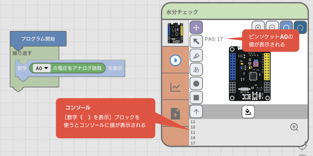 土壌水分センサは、土の中の水分量を測定することができます。水分がない状態が0で、水分が多くなるほど数値は大きくなります。このように量や大きさなどの程度を数値でプログラムに渡すことをアナログ入力と呼びます。