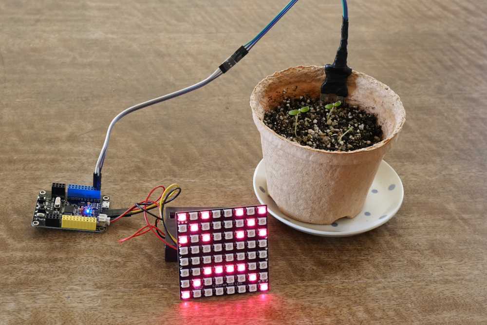土壌水分センサの使い方がわかったところで、早速LEDパネルで警告を出す仕組みを作りましょう。