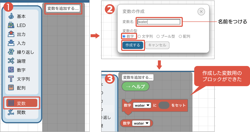新しい変数を作成し「water」と名前をつけます。