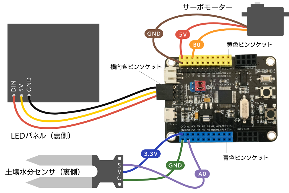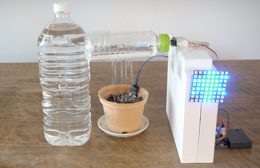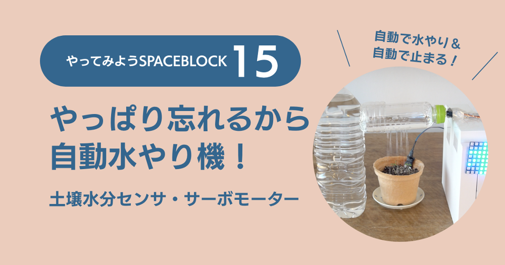 前回、水やり警告システムを作ったのですが、警告してもやっぱり水やりを忘れてしまう人がいたら……。いっそ、SPACEBLOCKで自動水やり機を開発してしまいましょう! 「土壌水分センサモジュール」で水分量をチェックして、足りなければ水やりをスタート。十分な水分になったら自動的に止めます。「180°マイクロサーボモーター」を使いますよ。
