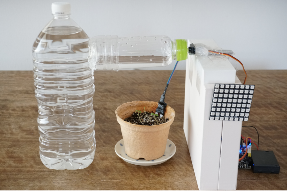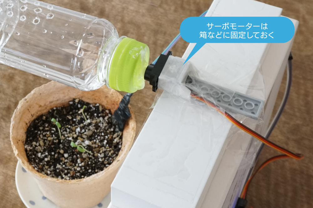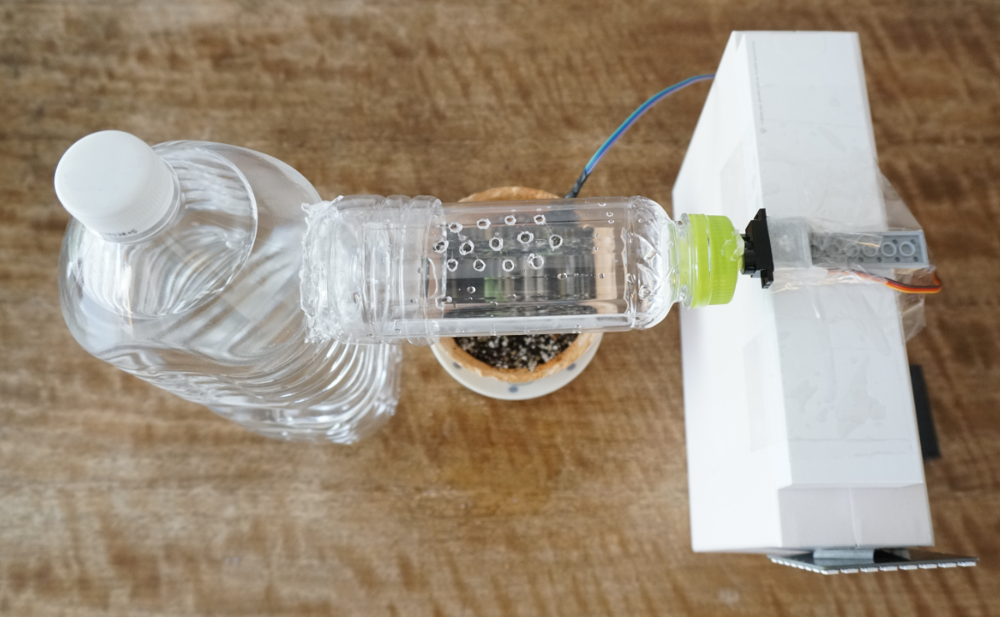 小さめのペットボトルの一方向にだけ穴をあけ、水をボトルの半分ほど入れ横に倒します。穴が上部に向いているときは水が出ませんが、くるりと回転させて穴が下部にくると水が落ちるという仕組みです。ペットボトルキャップにサーボホーンを接着して、サーボモーターの角度をプログラムで操作してペットボトルを回転させます。