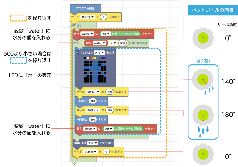 [繰り返す]の内側にさらに[もし《 》なら繰り返す]があることと、変数「water」に土壌水分センサの値を入れるタイミングに注目してください。