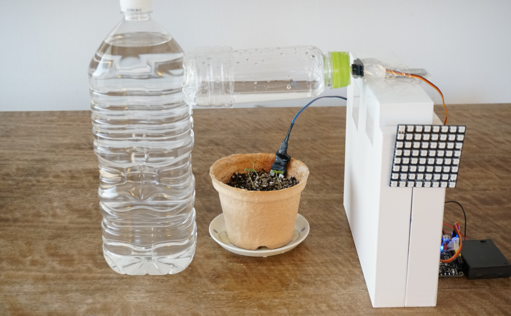 動画では、電池ボックスの電源を入れてからSPACEBLOCKが起動してプログラムが動き出しています。土壌水分が判定され水分量が足りない状態だったので、自動水やり装置が動き始めたのです。