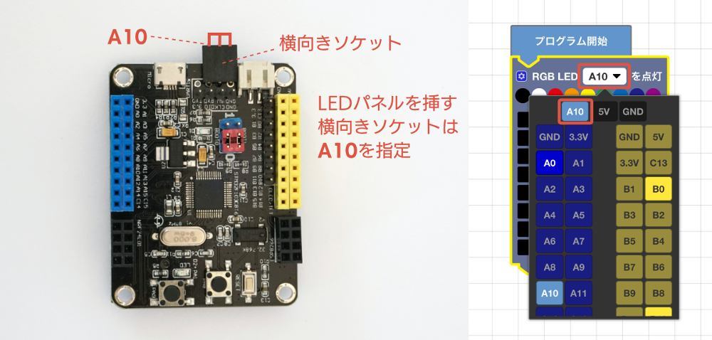 [RGB LED(A10)を点灯]ブロックの「A10」というのは、LEDパネルを挿した横向きソケットの番号です。このように、SPACEBLOCKに何か別のパーツを接続したときは、プログラムをする際に接続したソケットの番号を指定します。