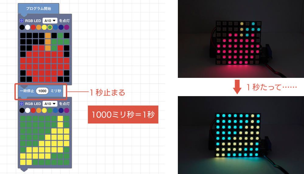 今回のように、次のブロック進む前に止まっていて欲しいときは[一時停止(1000)ミリ秒]を使うことを覚えておきましょう。ライトや動きなどを指示するプログラムではとてもよく使う技です。